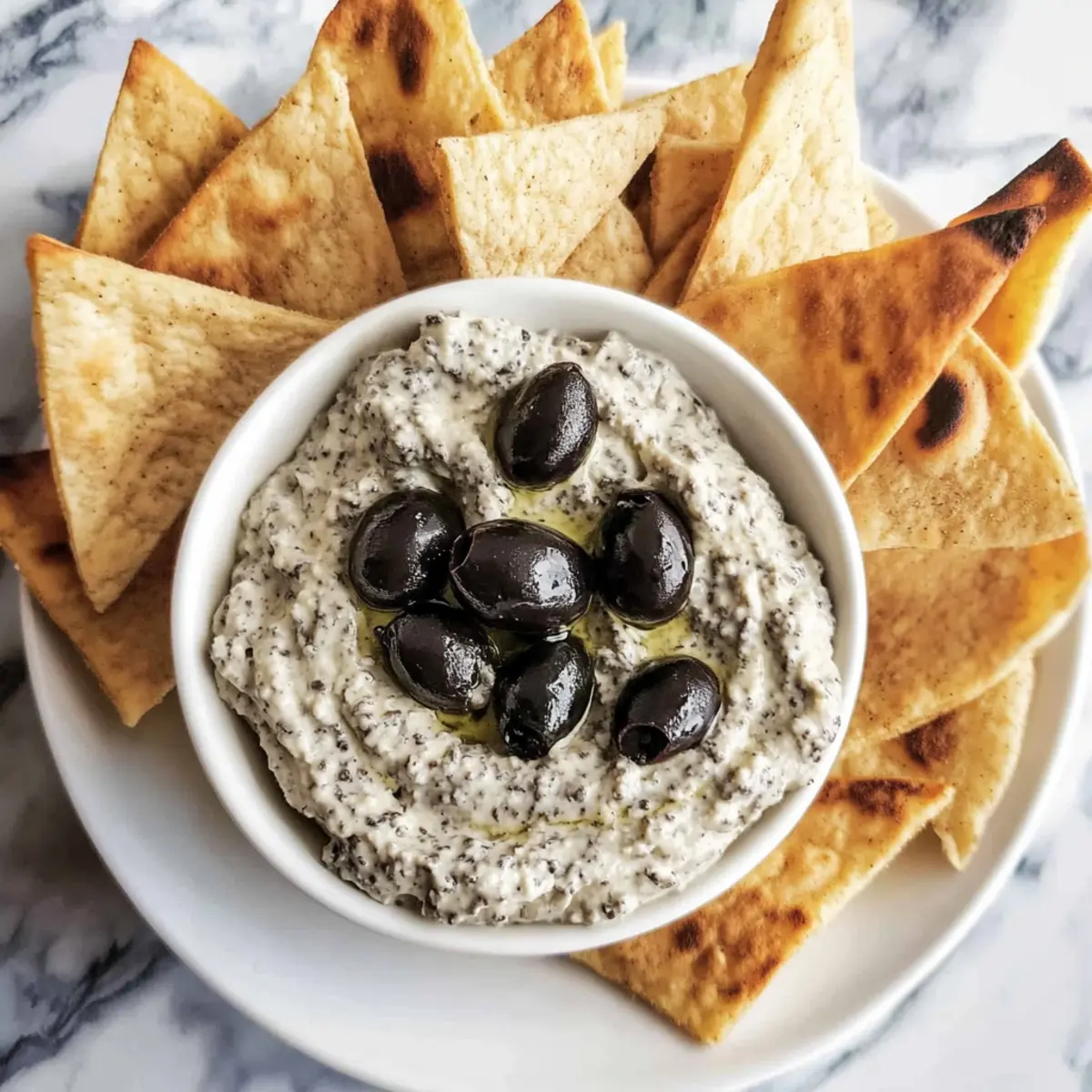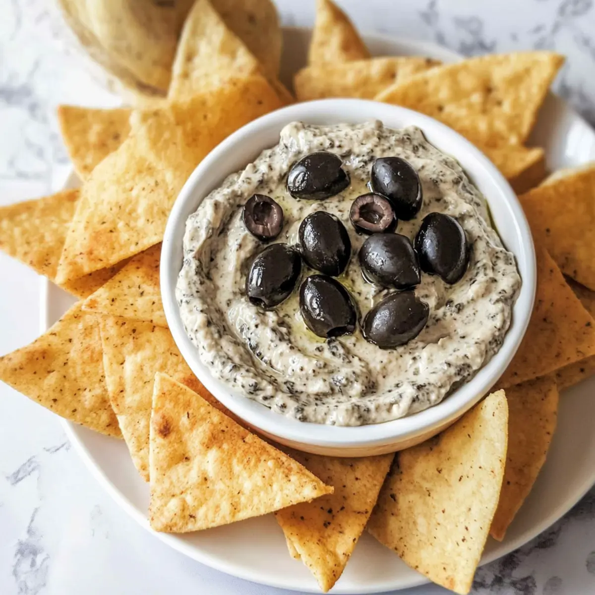 - Transfer your Black Olive Dip into a charming serving bowl. Arrange pita chips or crackers around it.