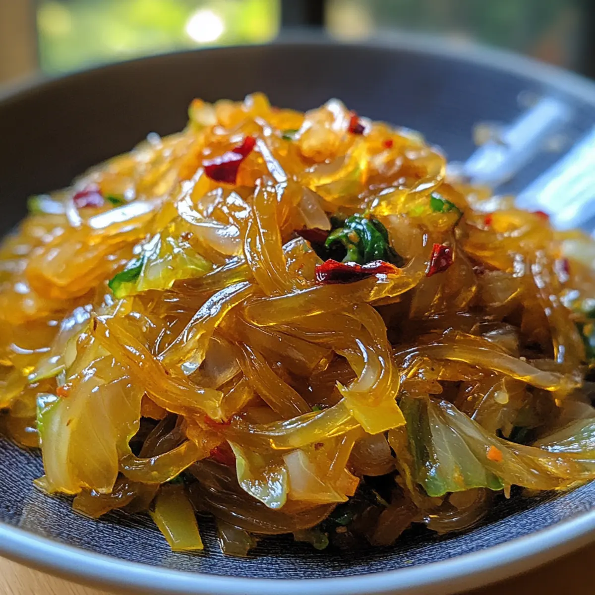 Now it’s time to bring the dish together! Add the soaked glass noodles to the skillet along with your sauce mixture. Gently toss everything together for about 2 minutes, ensuring the noodles absorb the flavors and the cabbage is cooked to tender perfection.