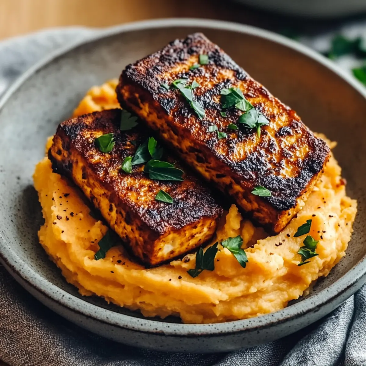 Savory Tofu Steak with Creamy Mashed Sweet Potato Delight