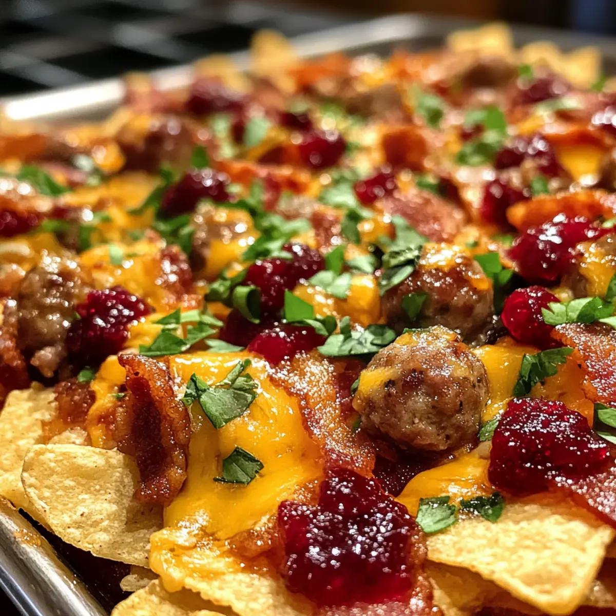 On the prepared baking tray, evenly layer crispy tortilla chips in a single layer. Then, alternate layers of grilled sausage meatballs, cooked chicken, sweet cranberry sauce, and melty cheese. Repeat these layers until you run out of ingredients, ensuring a generous amount of toppings for your festive dish.
