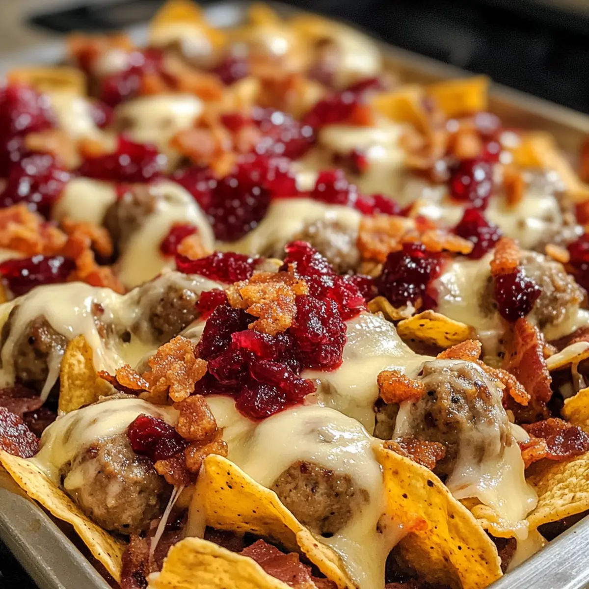 - Layer crispy tortilla chips in a single layer on the prepared baking tray, followed by sausage meatballs, cooked chicken, cranberry sauce, and cheese.