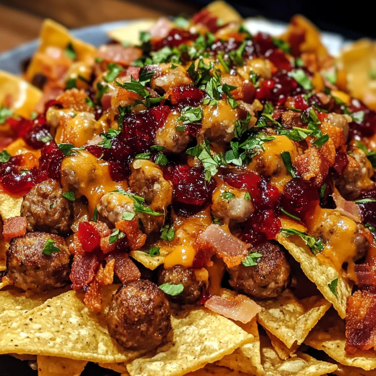 The aroma of sizzling bacon and savory sausages fills the air as I prepare to unveil a festive treat that will transform your holiday gatherings. My Ultimate Christmas Nachos with Sausages and Bacon Bliss are not just any nachos; they’re a celebration on a platter, combining crispy tortilla chips with gooey melted cheese, crunchy bacon, and juicy sausage meatballs, all enhanced by a touch of sweet cranberry sauce. Not only are these nachos quick to whip up, taking just 15 minutes of cook time, but they also promise to win over the hearts—and appetites—of family and friends at your holiday feast. Imagine sharing a dish that’s both an appetizer and a crowd-pleaser! Are you ready to elevate your holiday snacking experience?