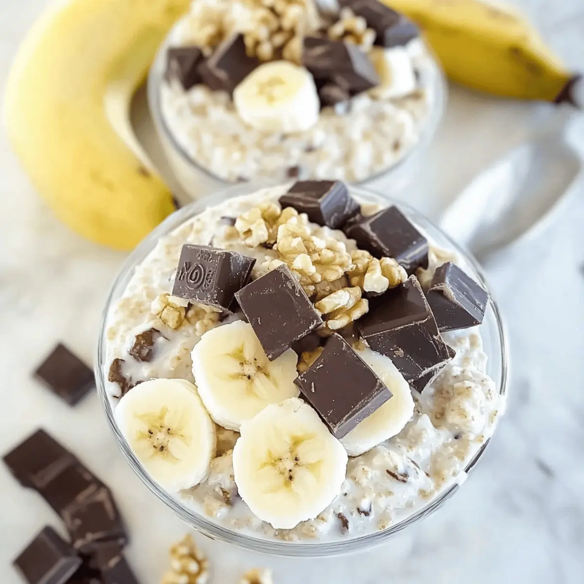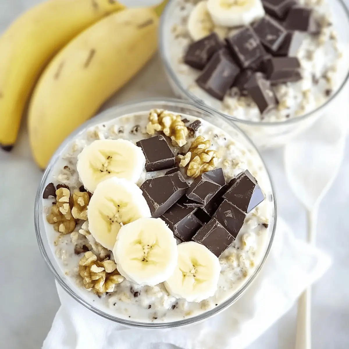 Spoon the Chunky Monkey Overnight Oats into serving bowls or jars. If desired, enhance the visual appeal by topping each serving with additional banana slices, a sprinkle of chopped walnuts, and a few extra chocolate chips. The delightful toppings will create a mouthwatering presentation, ready to be enjoyed.