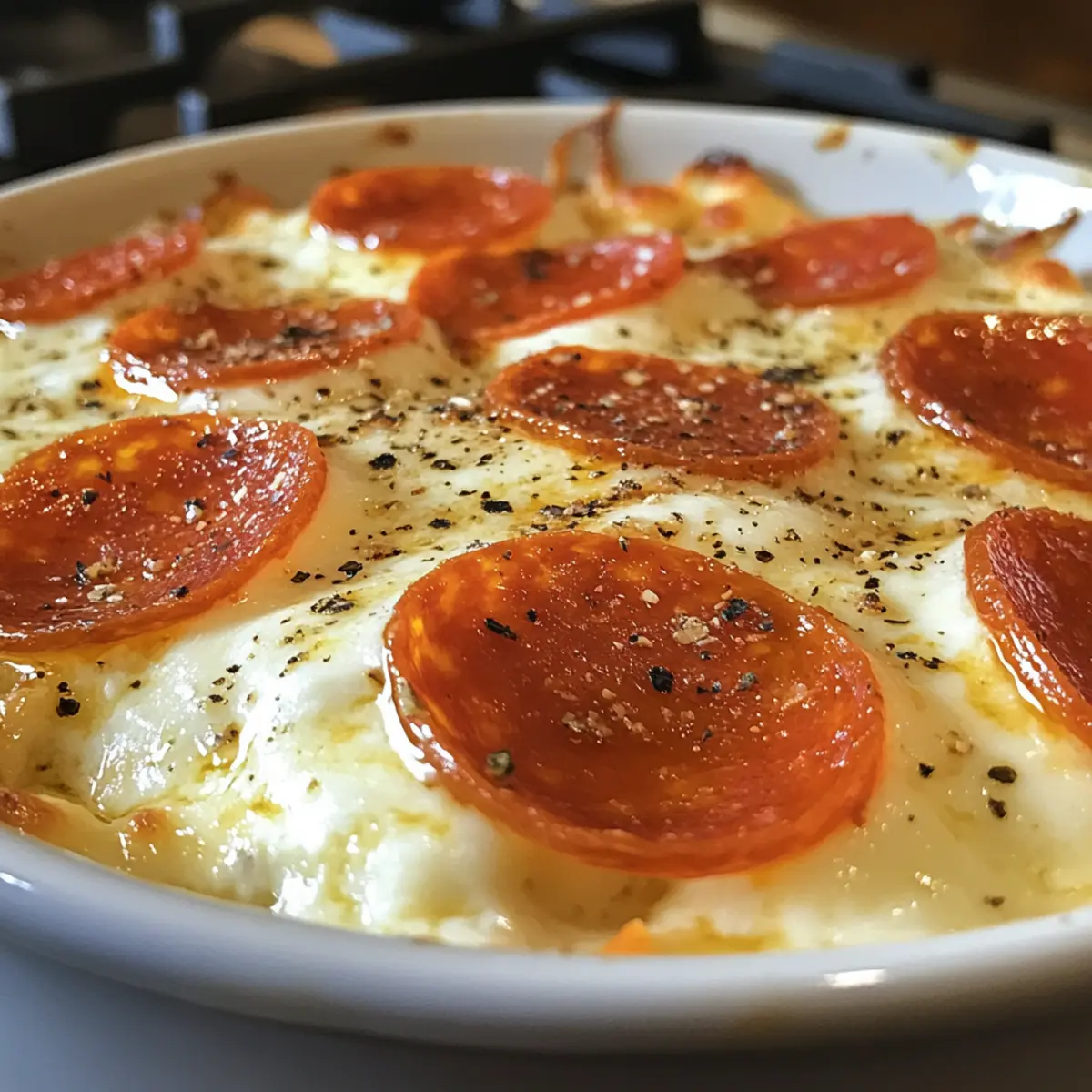 - Transfer the mixture to an oven-safe bowl, top with mozzarella cheese and extra pepperoni if desired.