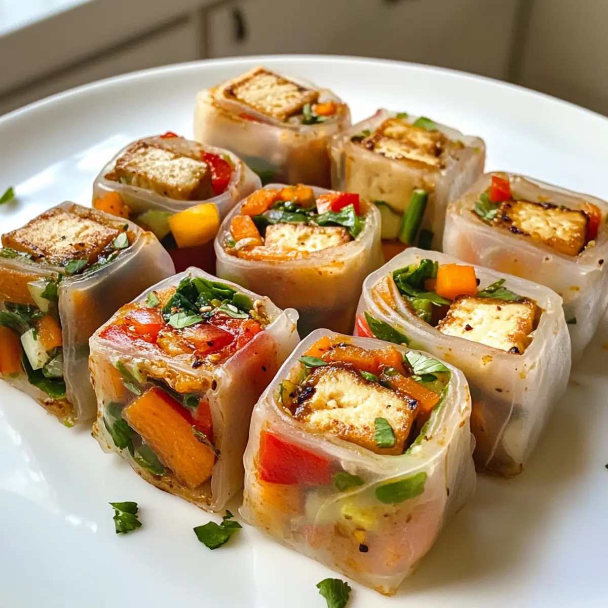 Fill a shallow dish with warm water and soften one rice paper wrapper by dipping it for 10-15 seconds until pliable. Lay it on a clean surface and place a couple of spoonfuls of the vegetable-tofu mixture on the lower third of the wrapper. Fold the sides over the filling and tightly roll it up, ensuring all ends are sealed to create your crispy air fryer rice paper rolls.