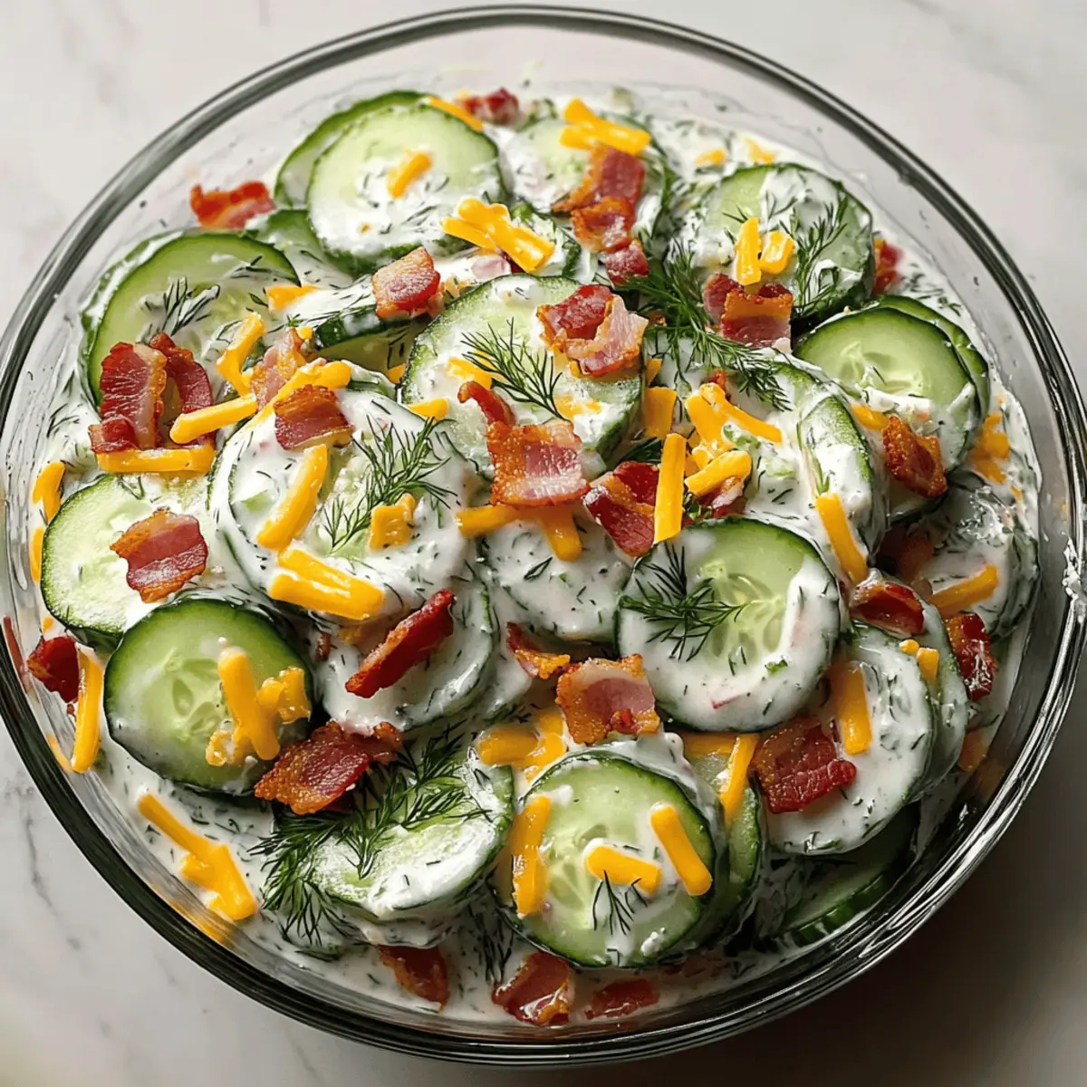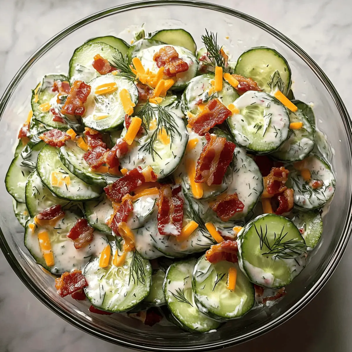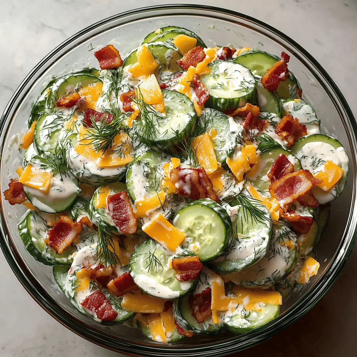 - Combine Salad Ingredients: Add cheddar cheese, crumbled bacon, red onion, and dill to the cucumbers; gently fold together.