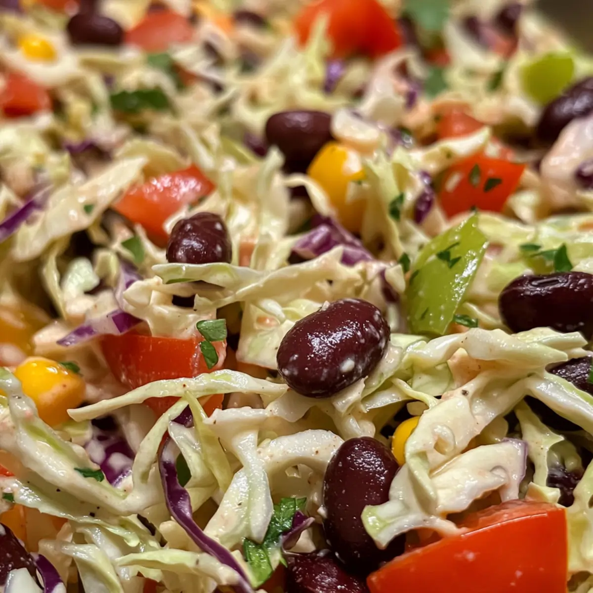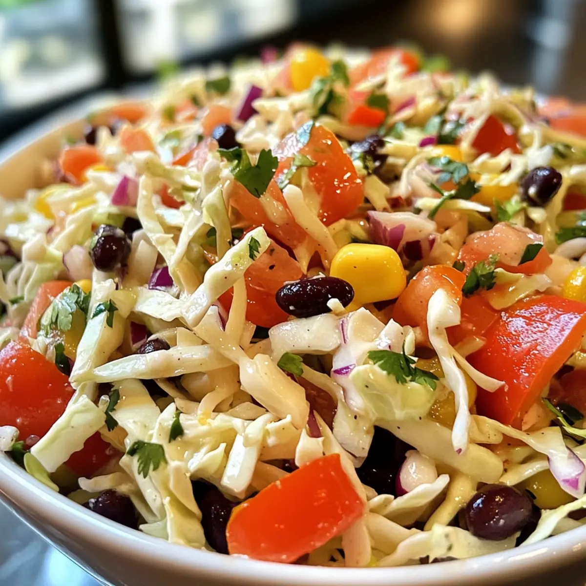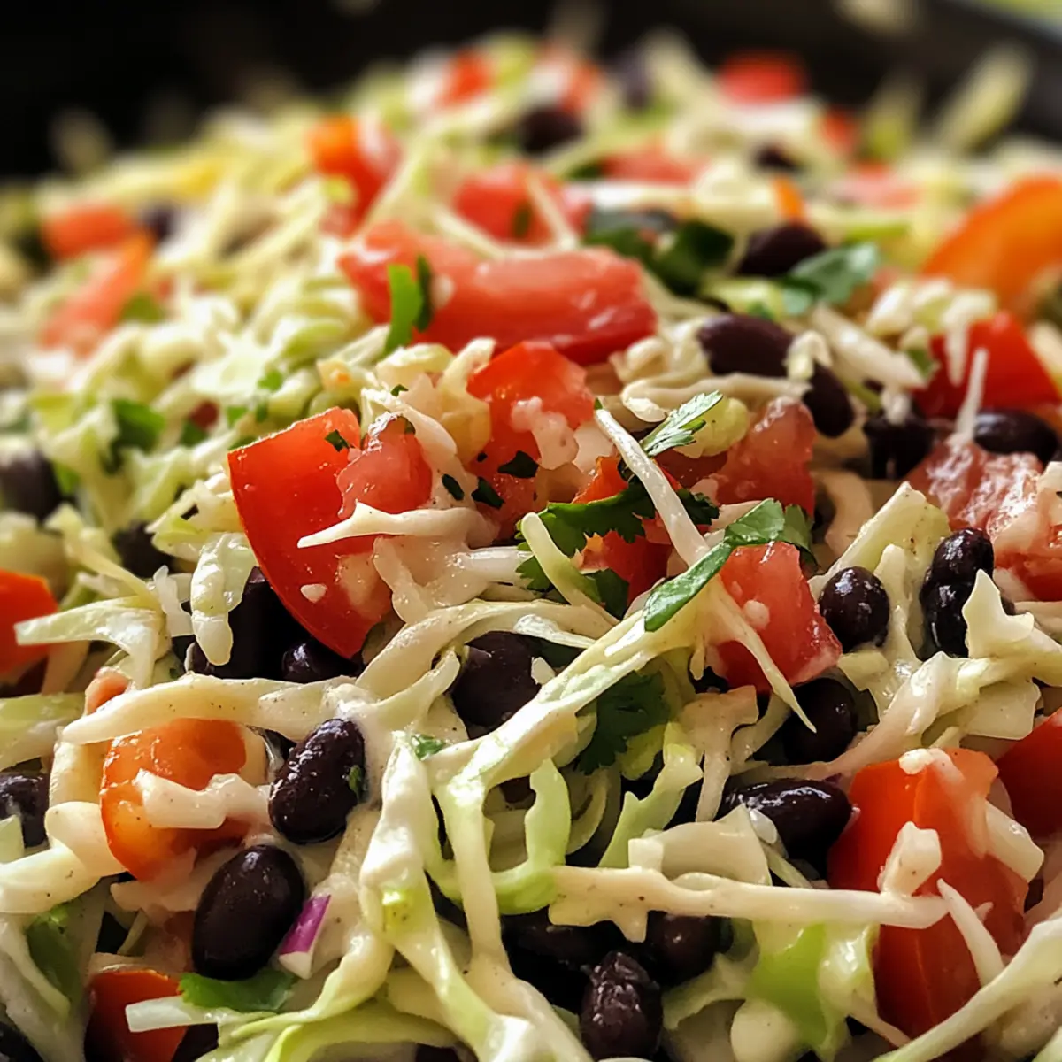 In a large mixing bowl, add 4 cups of tri-color coleslaw mix, 1 diced red bell pepper, halved grape tomatoes, 1 can of rinsed black beans, and 1 cup of grilled or blackened corn. If you like extra heat, finely chop one jalapeño and toss it in, along with ¼ cup of chopped cilantro. Gently stir the vegetables together until evenly distributed, showcasing a vibrant array of colors.