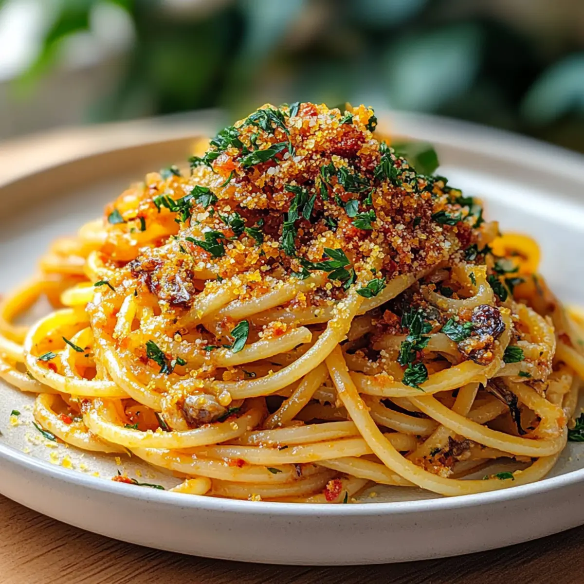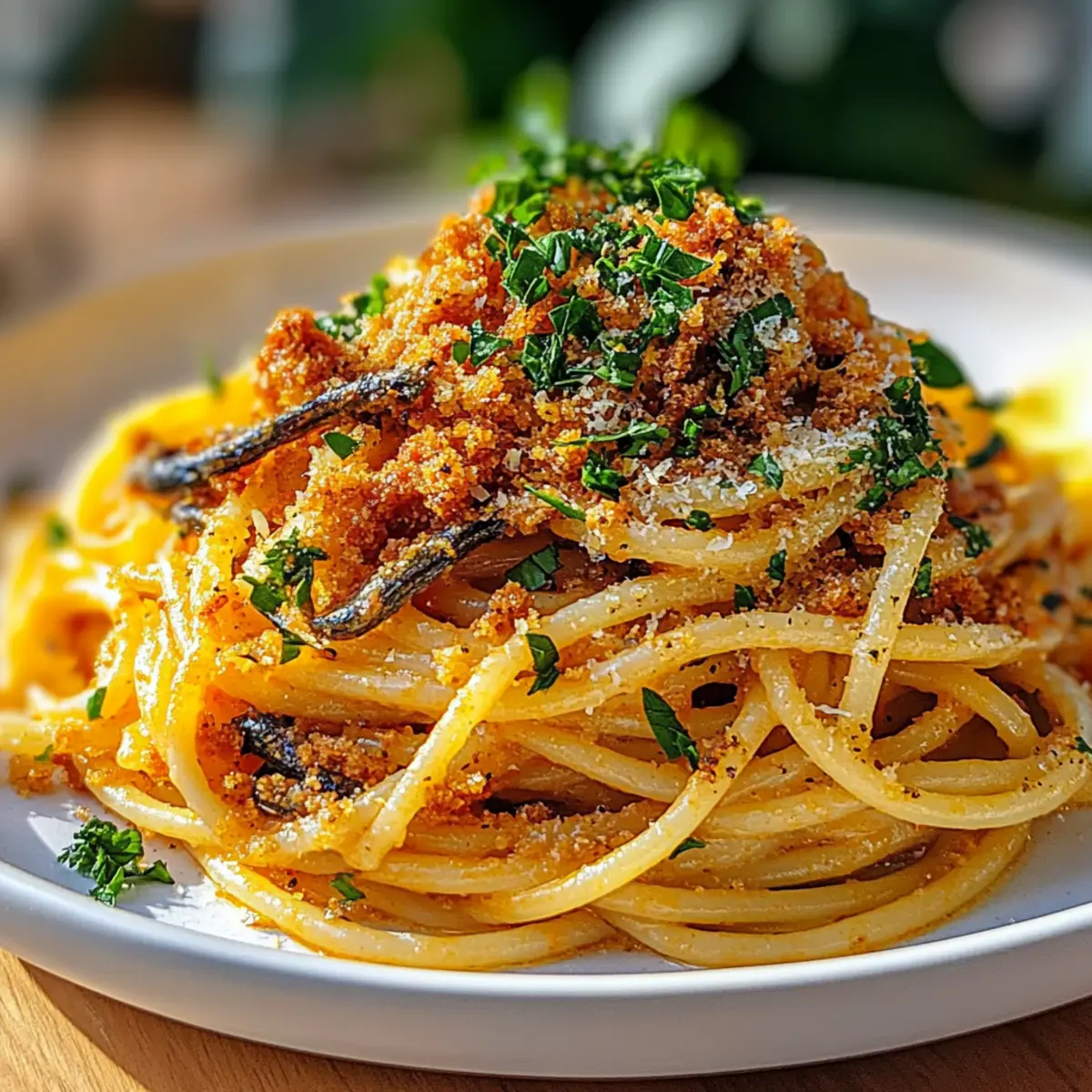 - Plate pasta and top with sardine crumble. Serve immediately.