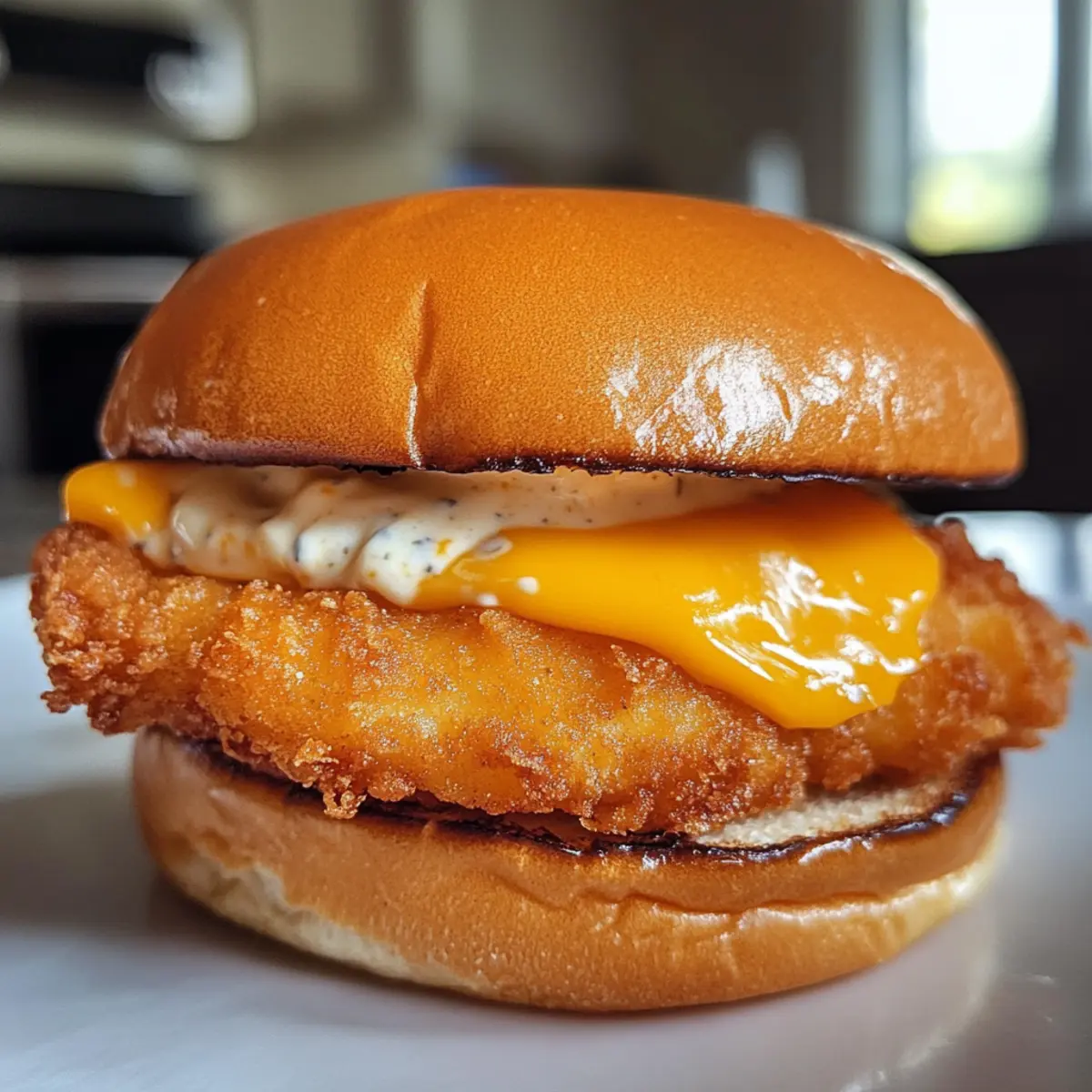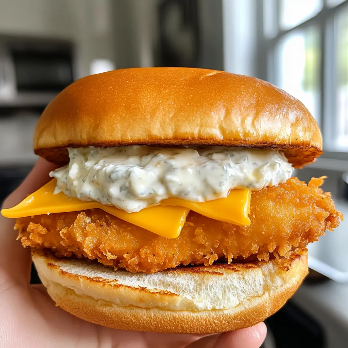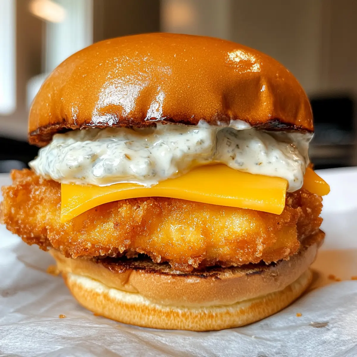 - Assemble the sandwich with tartar sauce, fried cod, cheddar cheese, and top bun.
