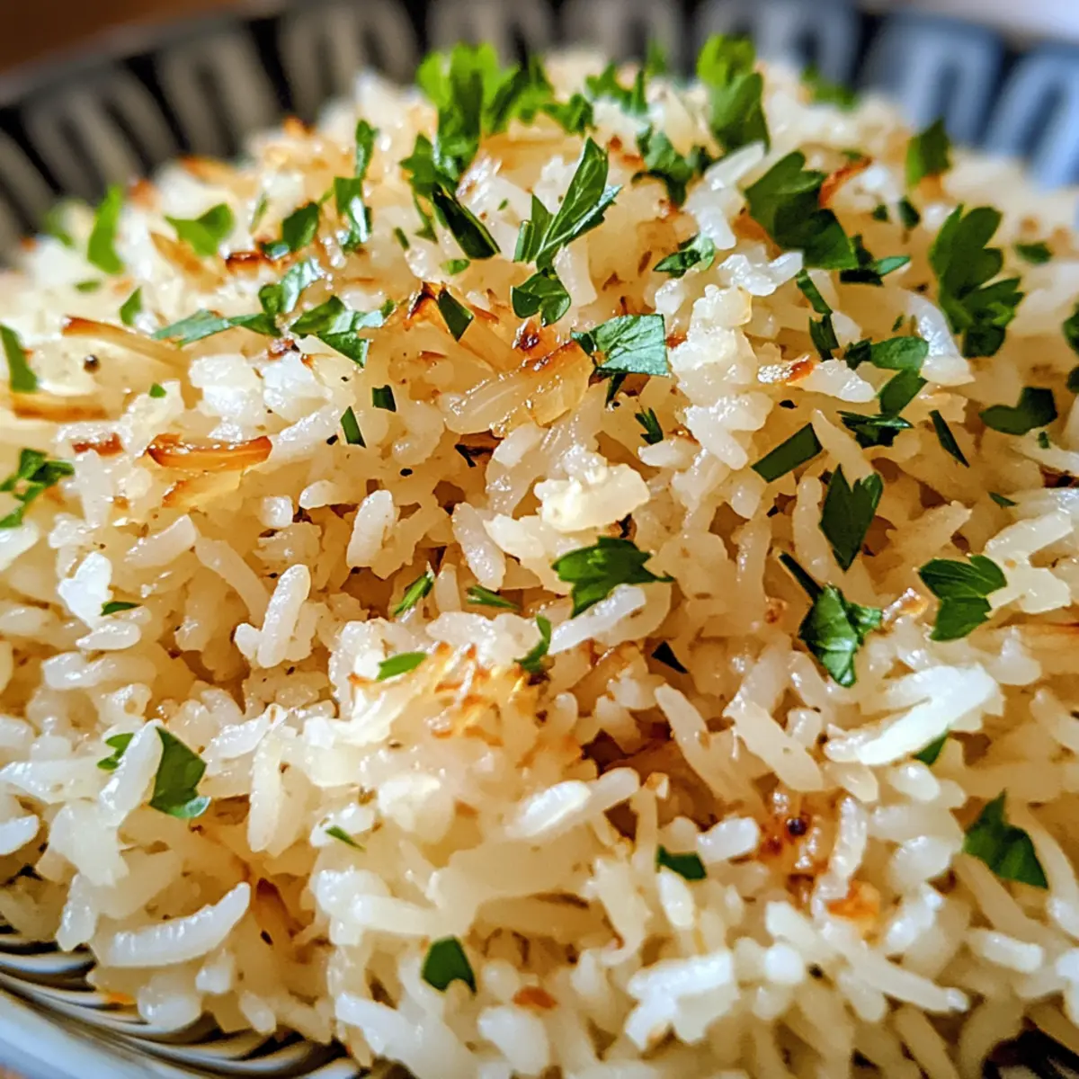 Finally, gently fluff the rice with a fork to separate the grains without squashing them. Transfer the fluffy rice to a serving dish and garnish generously with ¼ cup of freshly chopped parsley for a bright finish. Your Golden Onion Butter Jasmine Rice is now ready to delight the taste buds!