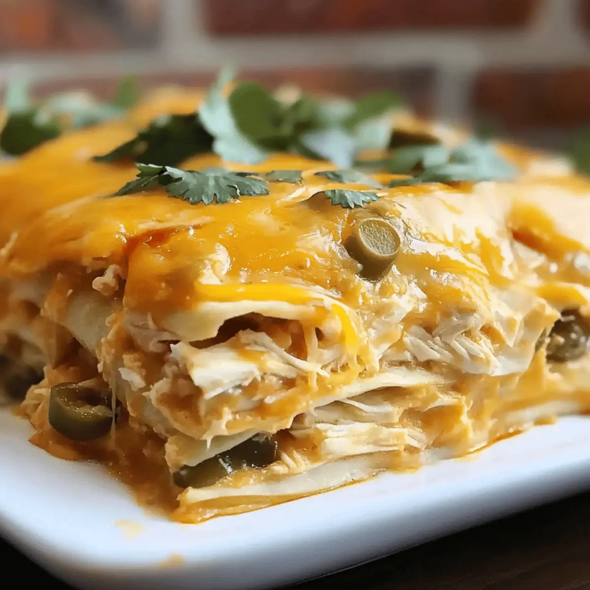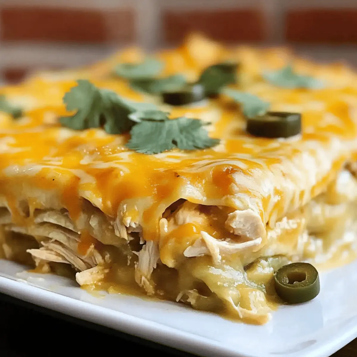 Once the timer goes off, carefully remove the casserole from the oven. Allow it to sit for about 10–15 minutes, letting the layers settle for easier serving. Slice into portions and enjoy your warm Green Chile Chicken Enchilada Casserole, perhaps garnished with fresh cilantro or jalapeños for an extra kick!