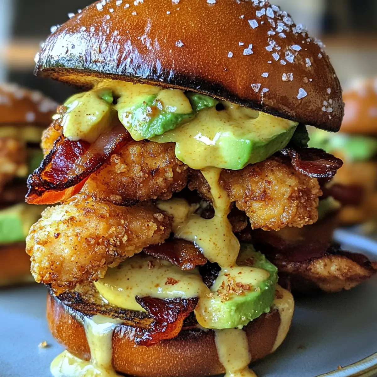 - Once the buns are golden and the cheese melted, layer the honey mustard-coated fried chicken on the buns. Top with cubed avocado and quartered cherry tomatoes.