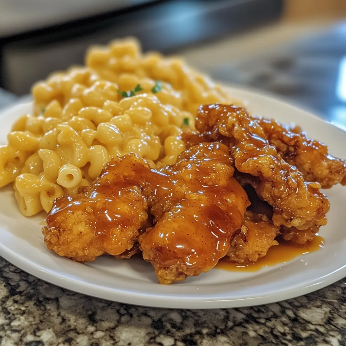 These Hot Honey Chicken Tenders paired with creamy Baked Mac and Cheese are sure to become a beloved favorite at your family dinners!