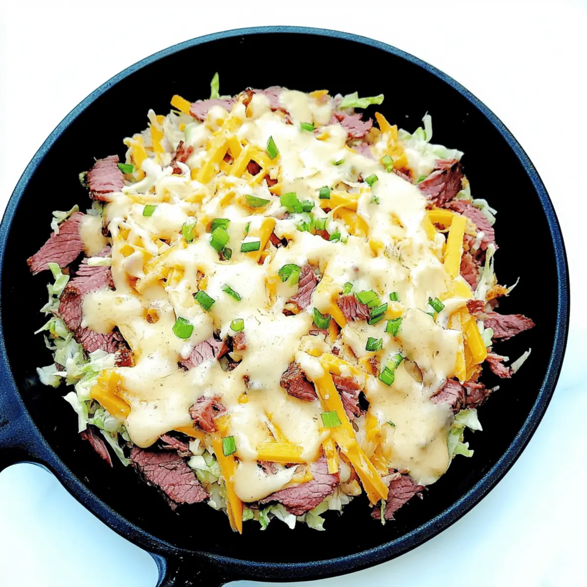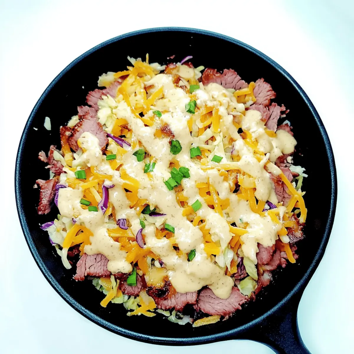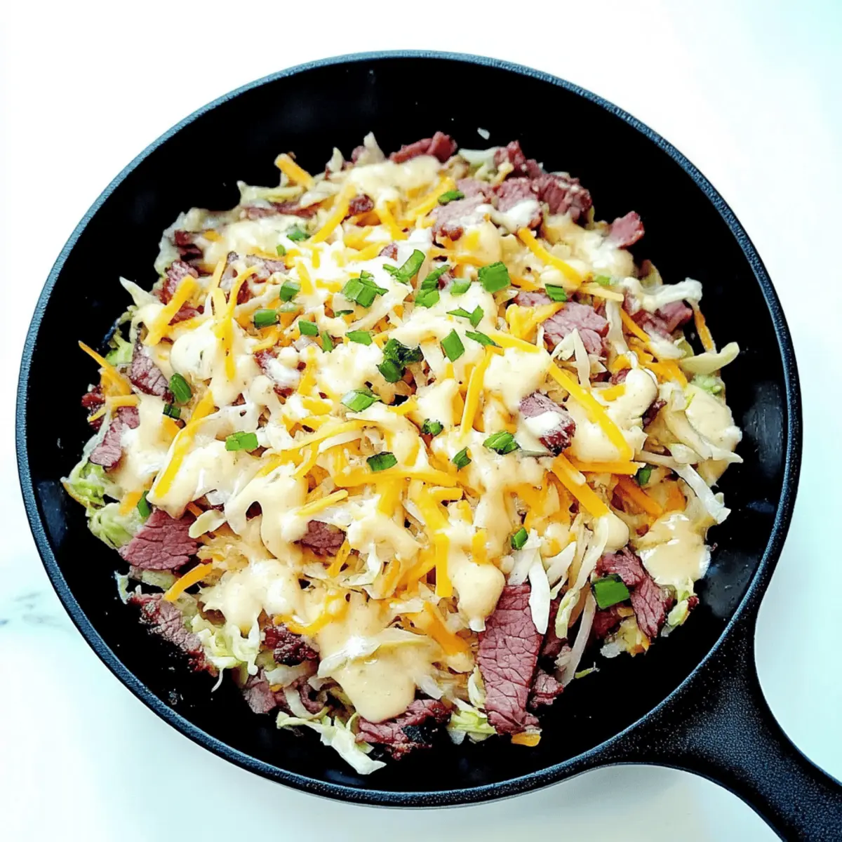 Remove the skillet from heat, and drizzle your homemade Russian dressing generously over the entire Keto Reuben in a Bowl. Garnish with thinly sliced scallions for a pop of freshness and color. Serve immediately and relish this delightful, satisfying meal that brings all your favorite Reuben flavors to the table!