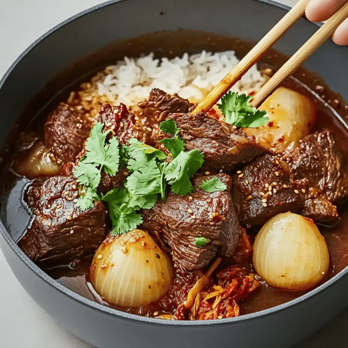 Once your Korean Style Pot Roast is ready, carefully transfer the beef to a cutting board and let it rest briefly before slicing. Serve it over bowls of cooked rice, allowing the savory sauce to soak into the grains. Garnish with chopped fresh cilantro and a side of kimchi to enhance this comforting dish with bright flavors.