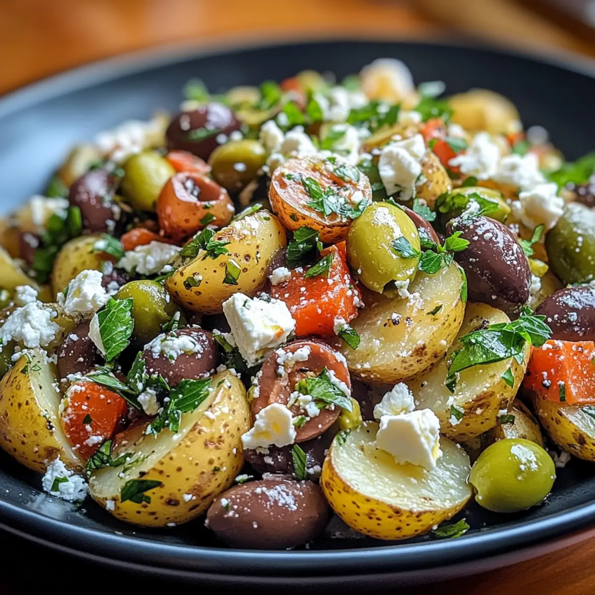 - In a large bowl, combine cooled potatoes, Kalamata olives, green olives, crumbled feta, parsley, and dill. Gently mix until evenly distributed.