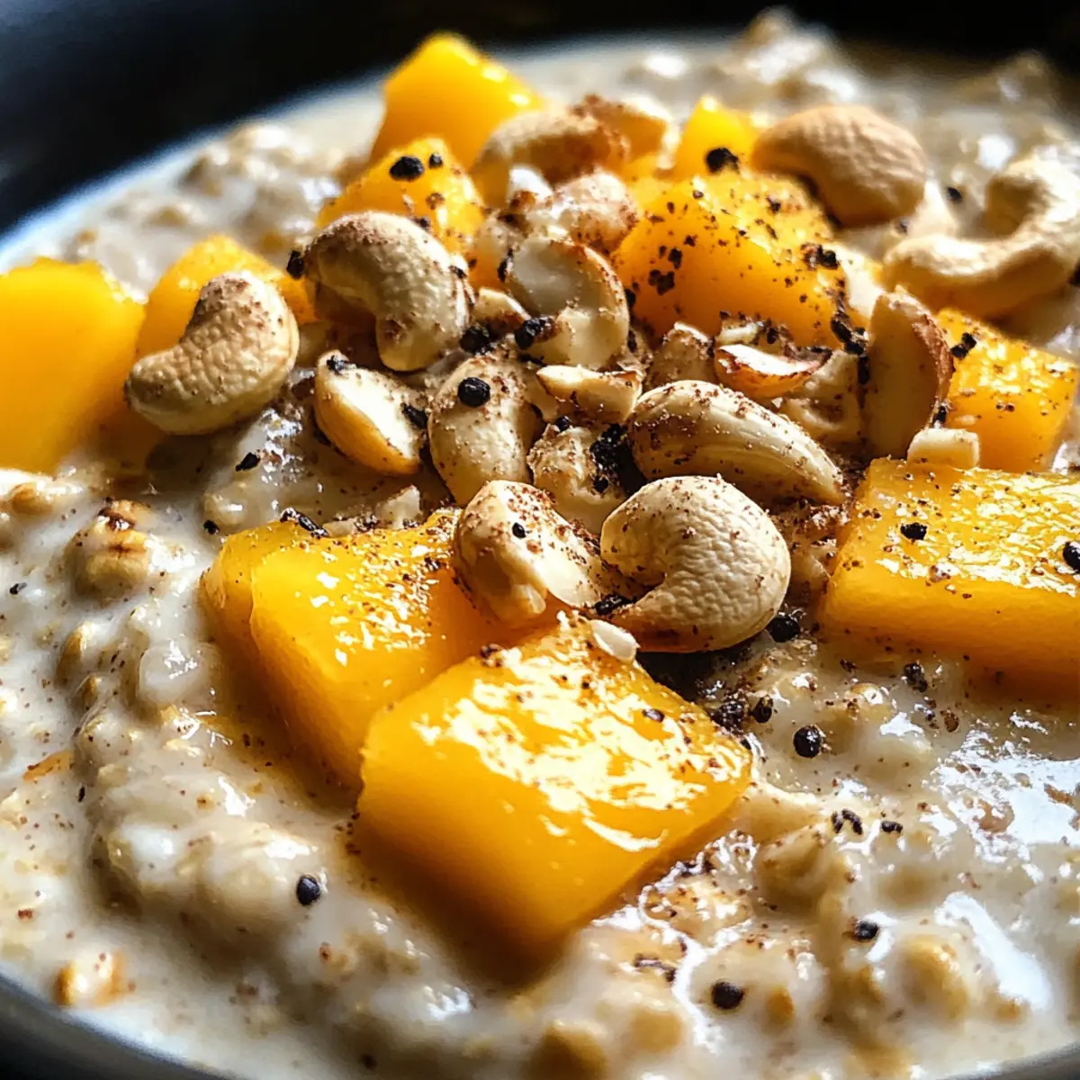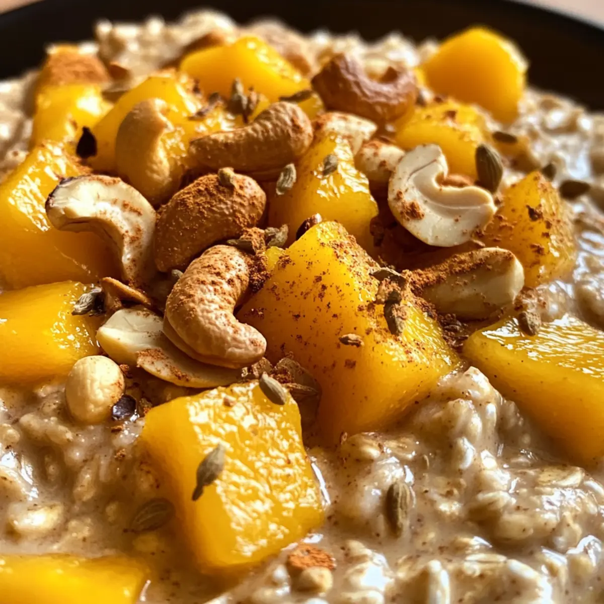 - Spoon oats into bowls and top with chopped nuts and dried mango or raisins. Optionally garnish with extra honey, cinnamon, or fresh fruit.