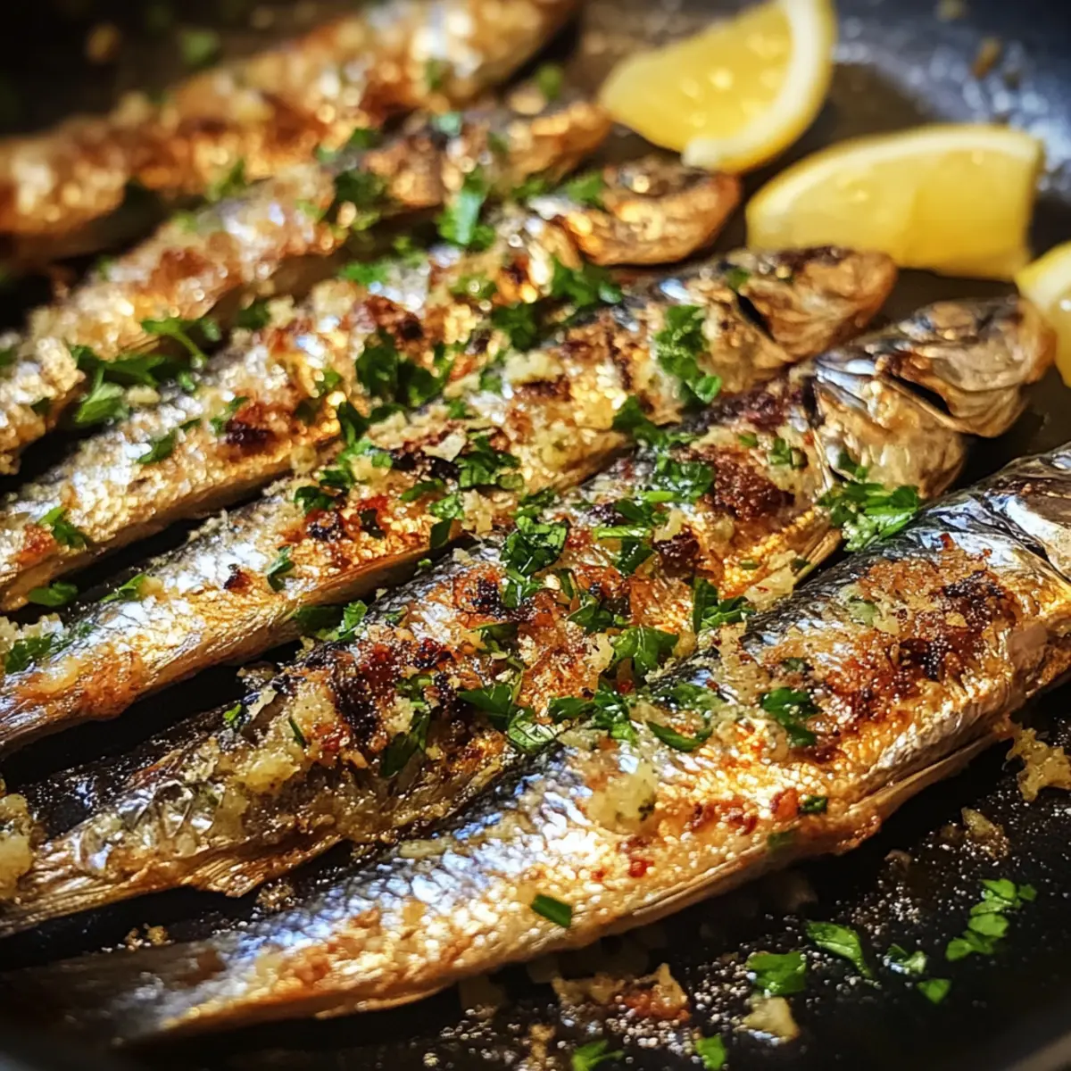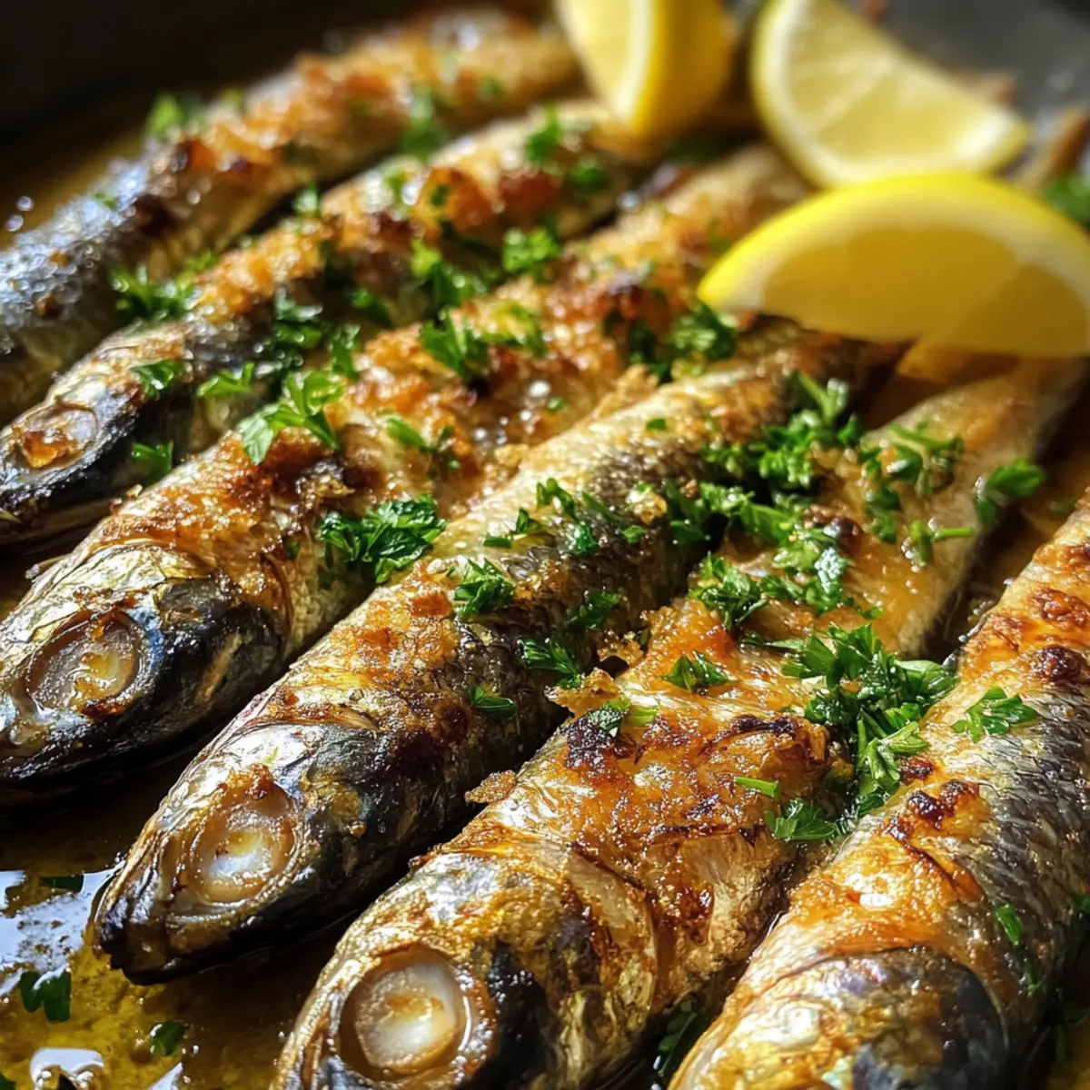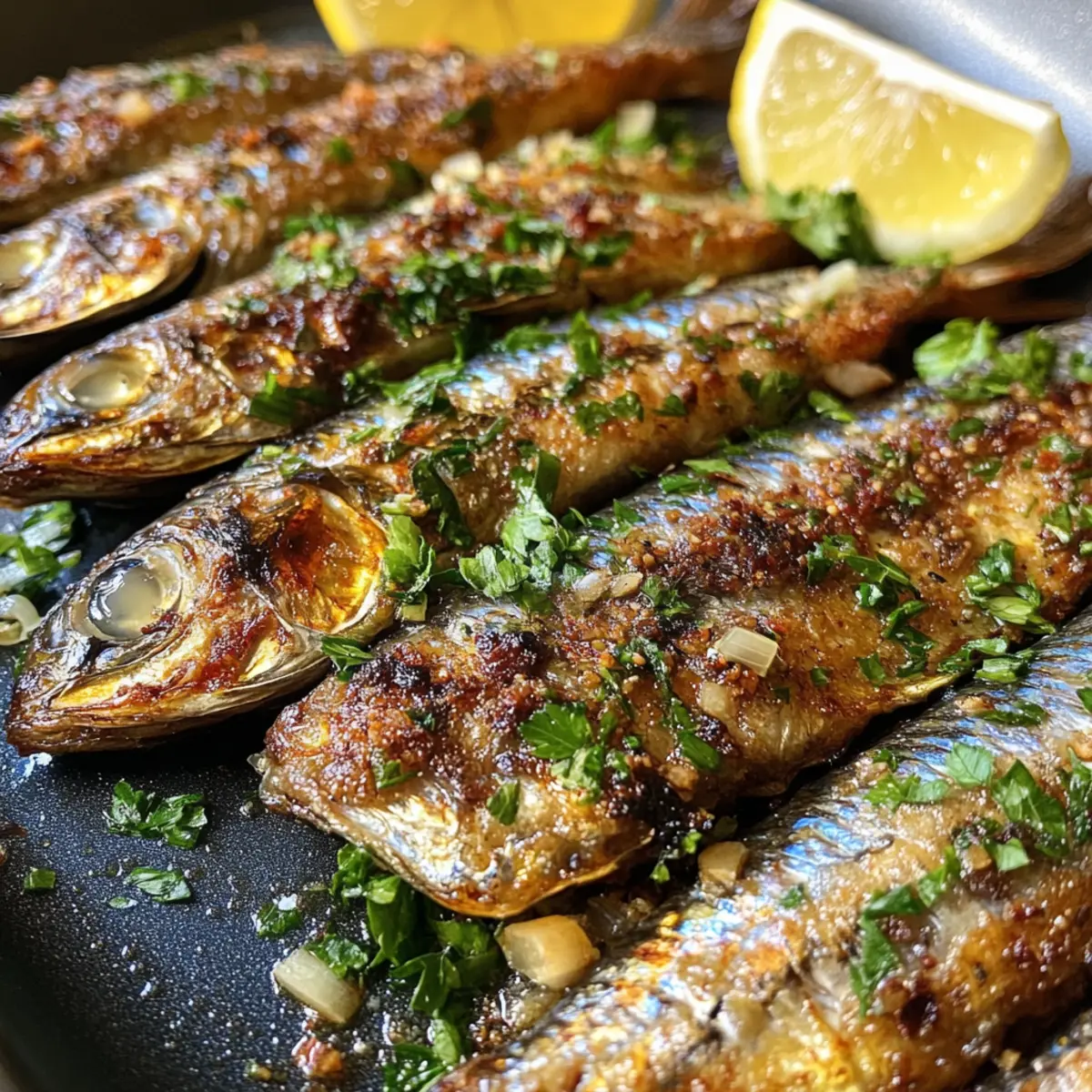 Finally, arrange the crispy pan-fried sardines on a serving platter and garnish with freshly chopped parsley and lemon wedges. The vibrant green of the parsley and the bright yellow of the lemon will enhance the dish’s appearance and flavors. Serve your sardines immediately for the best texture and enjoyment, paired with a chilled drink for an authentic experience.