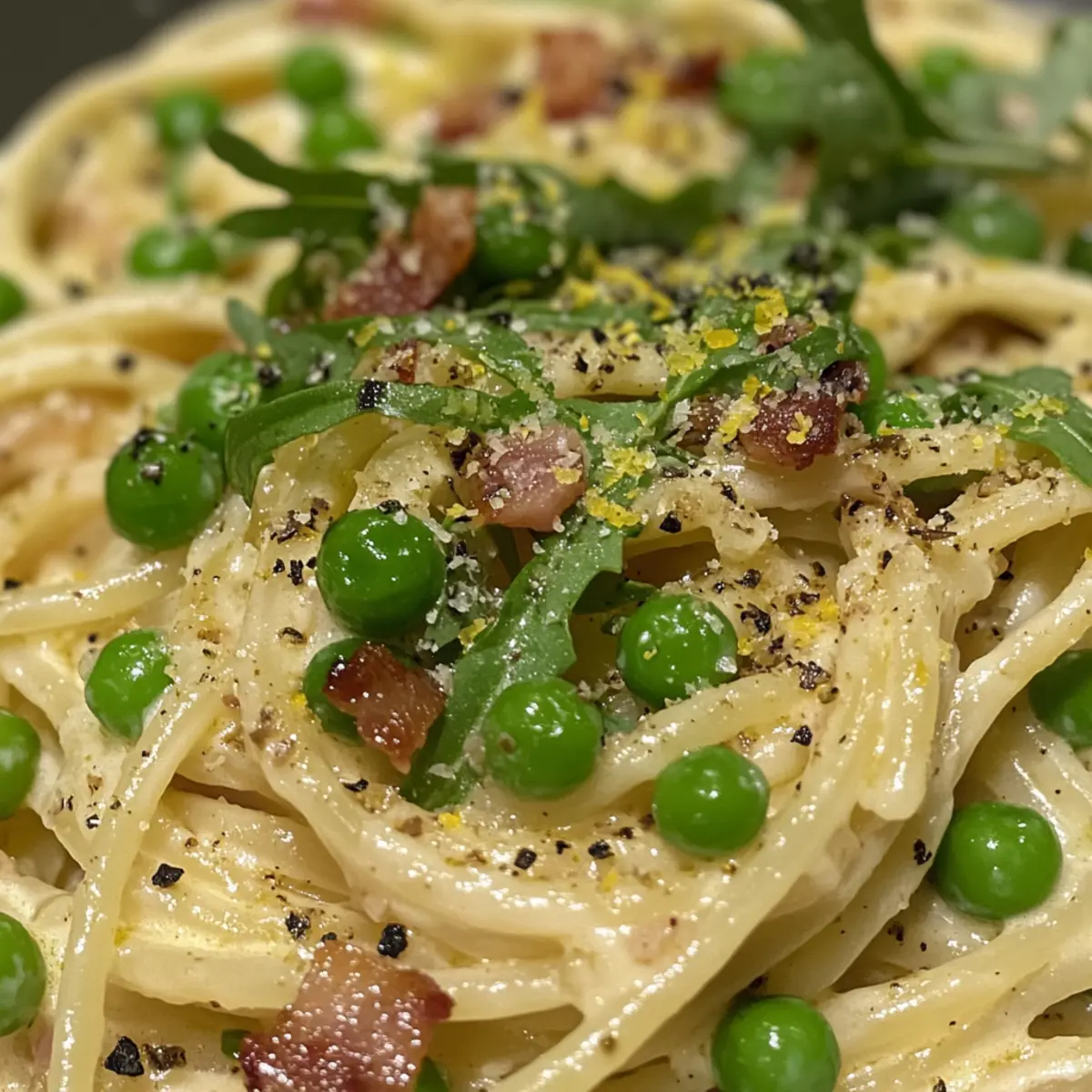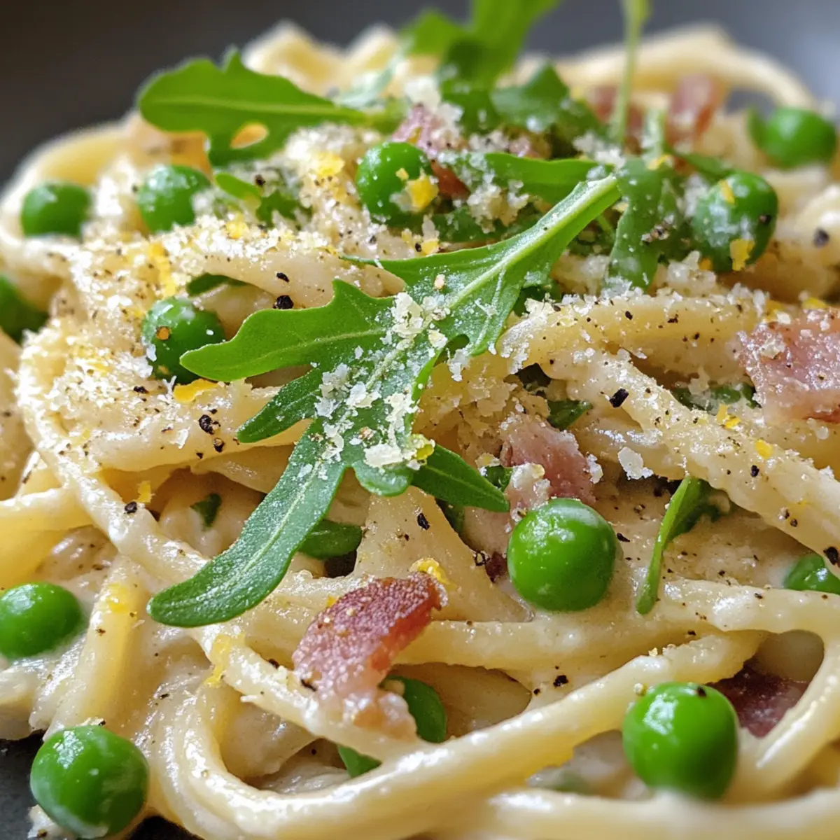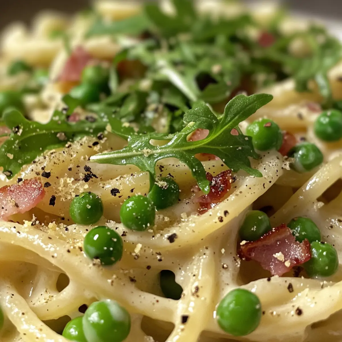 To finish your dish, fold in fresh arugula if using, allowing it to wilt slightly in the heat. Serve your creamy pasta with peas and pancetta in warm bowls, garnishing with extra Parmesan and a sprinkle of lemon zest for an inviting presentation. Celebrate your creation with loved ones and watch them delight in this easy, satisfying meal!