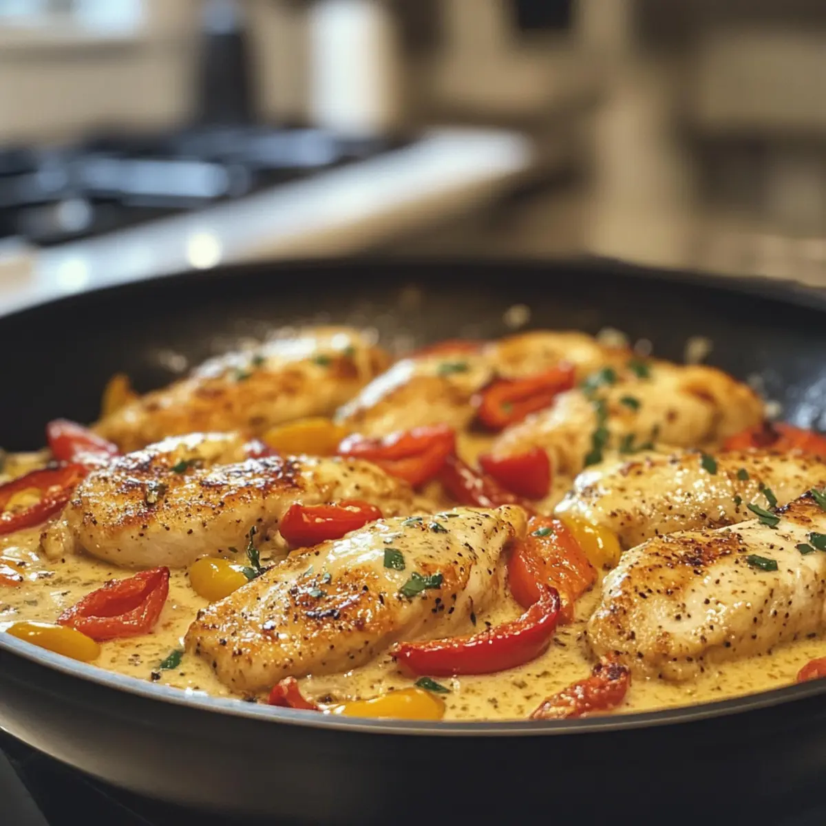 These Creamy Pepperoncini Chicken Skillet ingredients are perfect for meal prep! You can season and sear the chicken up to 24 hours in advance, storing it in an airtight container in the refrigerator. Additionally, prepare the sauce base (onions, garlic, stock, and roasted red peppers) up to 3 days ahead. Just refrigerate the mixture, ensuring it’s cooled fully before sealing to maintain freshness. When you’re ready to enjoy your meal, simply reheat the sauce on low until bubbling, add the cream and Parmesan, and return the seared chicken to the skillet to warm through. This way, you can savor this delightful dish without the fuss during your busy weeknights!