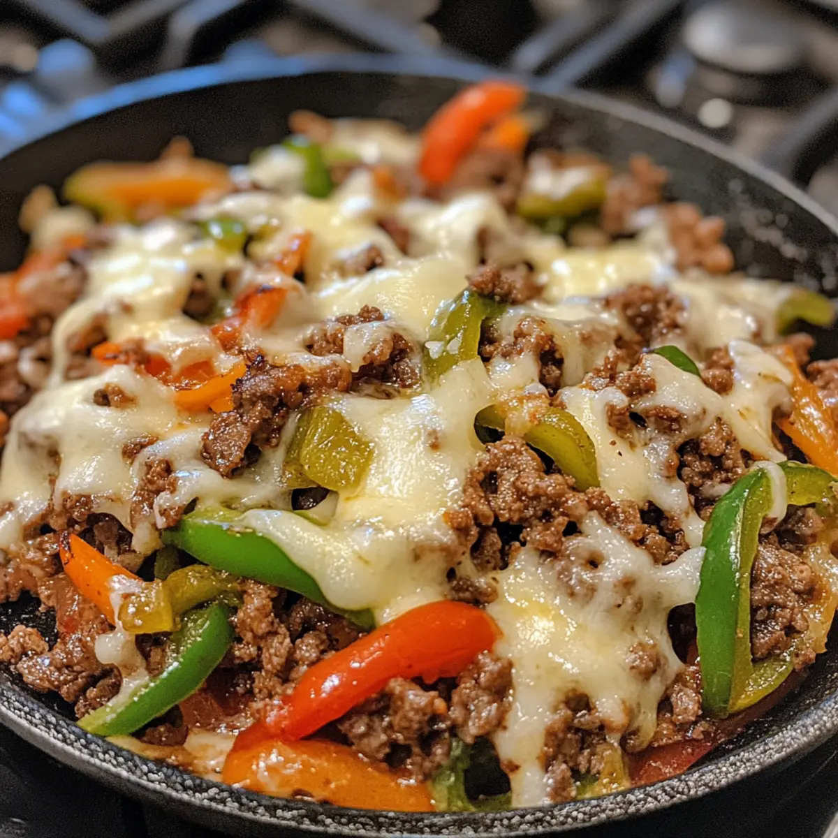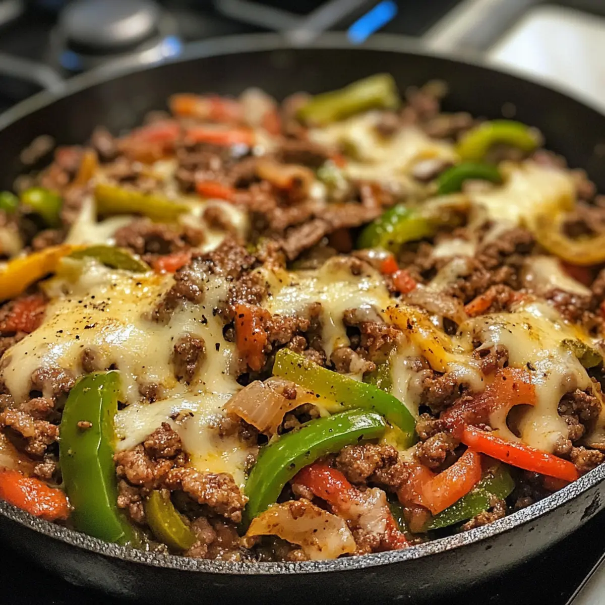 Return the cooked ground beef, sautéed onions, and green peppers back into the skillet. Mix everything together until the beef and vegetables are evenly coated with the sauce. Cook for an additional 2–3 minutes; this melds all the flavors together beautifully, creating a hearty filling for your Philly Cheese Beef Skillet.