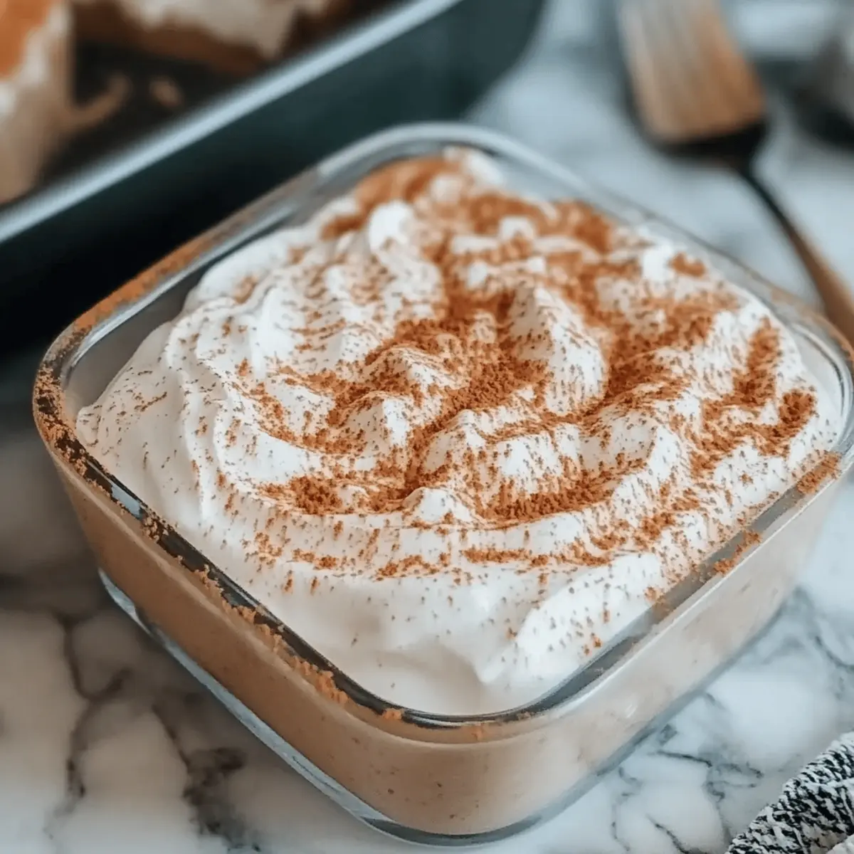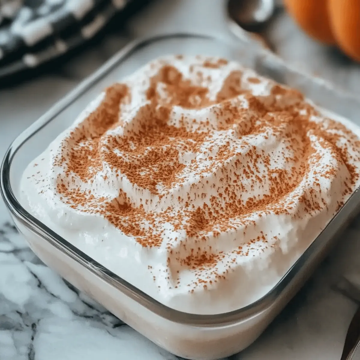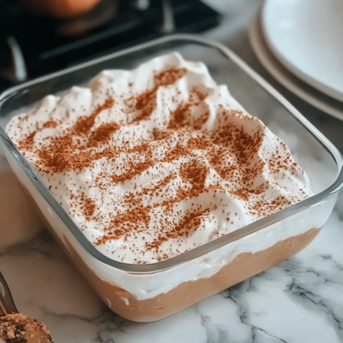 Smooth the thawed whipped topping over the pumpkin layer, creating a light and airy finish. Dust the top with a sprinkle of pumpkin pie spice for an extra touch of flavor and festive flair. This layer adds creaminess and a beautiful presentation to your dessert.