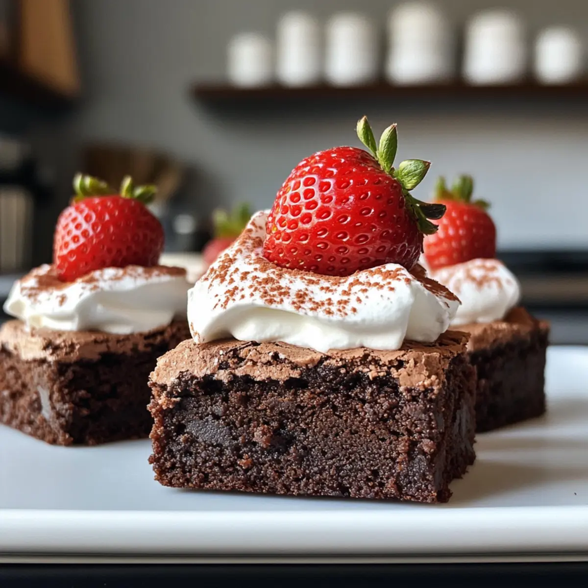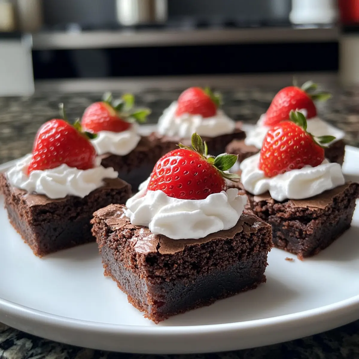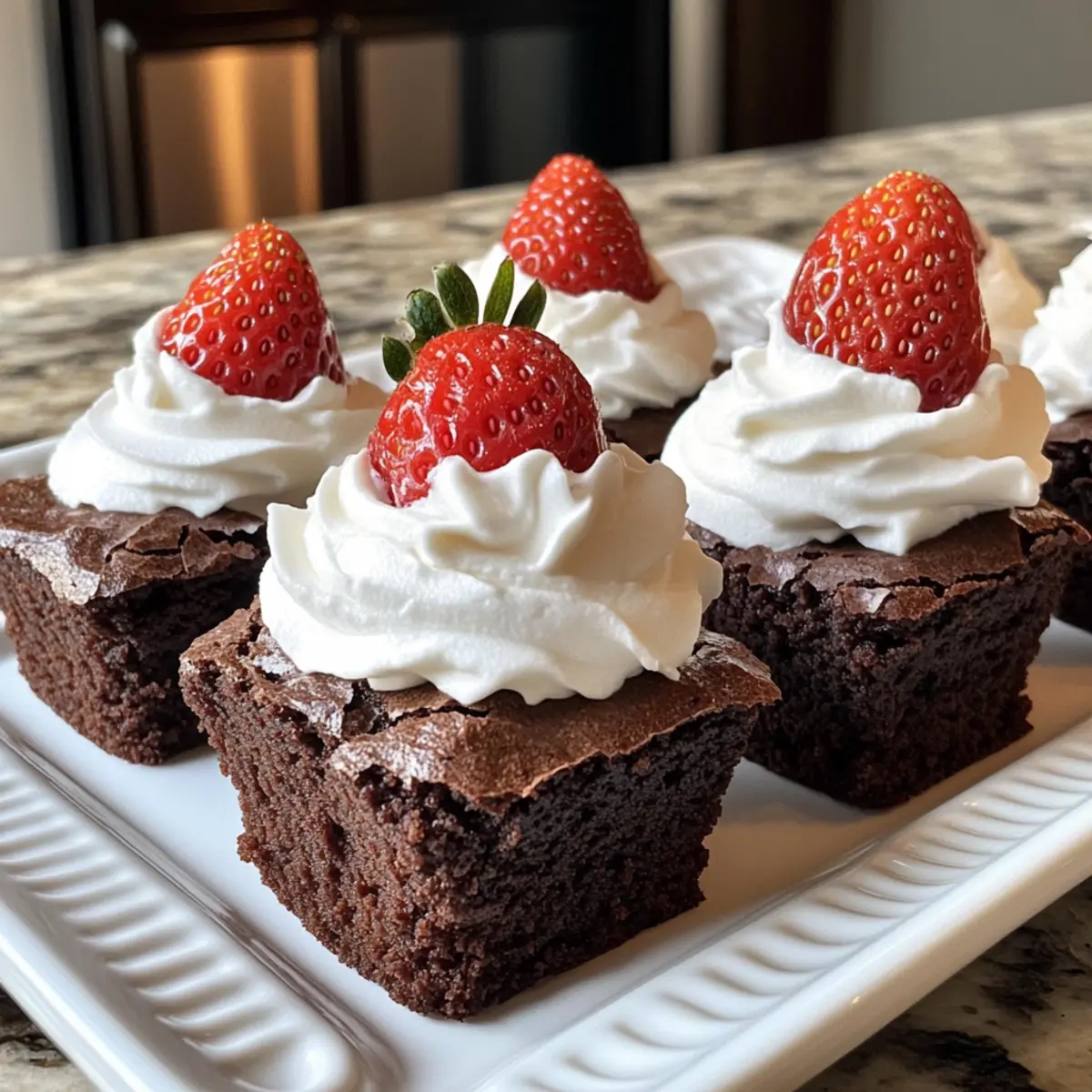 - Pipe the whipped cream on each brownie, place a strawberry on top, and add a dollop of cream on the tip.