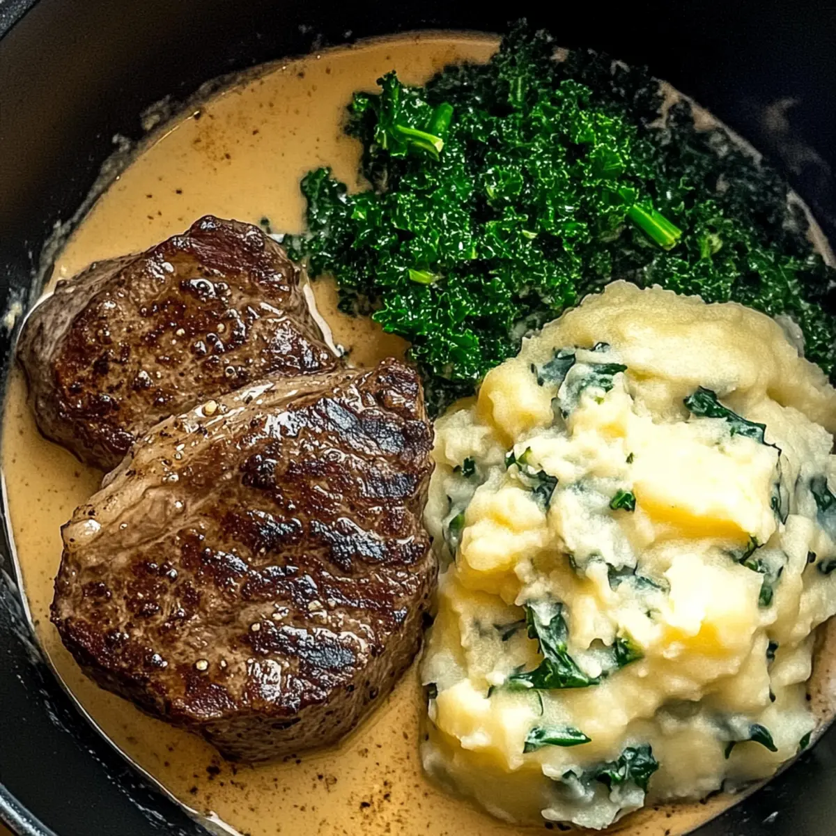 While the steaks are in the oven, bring a large pot of salted water to a boil. Peel and chop 2-3 Yukon Gold or Russet potatoes, adding them to the boiling water, and cook for 15-20 minutes until fork-tender. In the last few minutes of cooking, add 2 cups of chopped kale to the pot. Once done, drain and return to the pot, mashing with 2 tablespoons of butter and ½ cup of heavy cream until creamy and smooth.