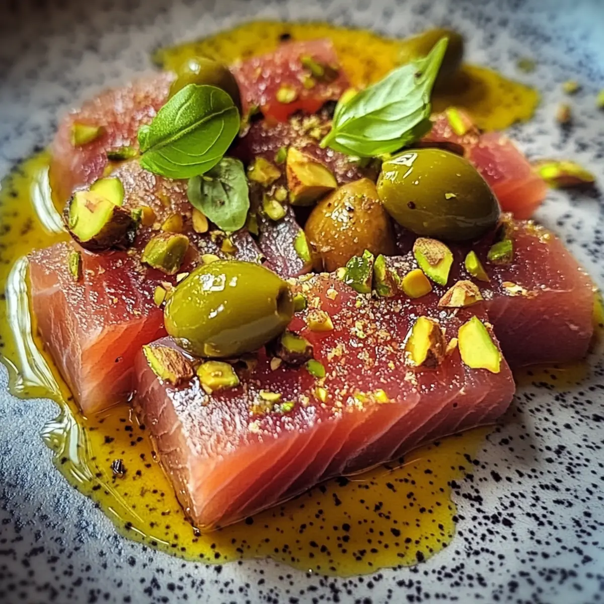 - Top the seasoned tuna with chopped Castelvetrano olives and crushed pistachios, then grate some lemon zest over the dish.
