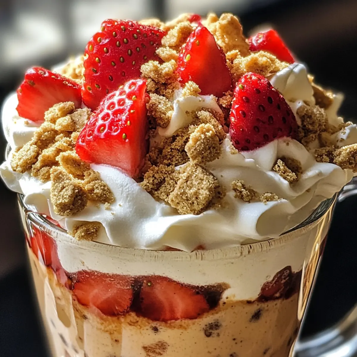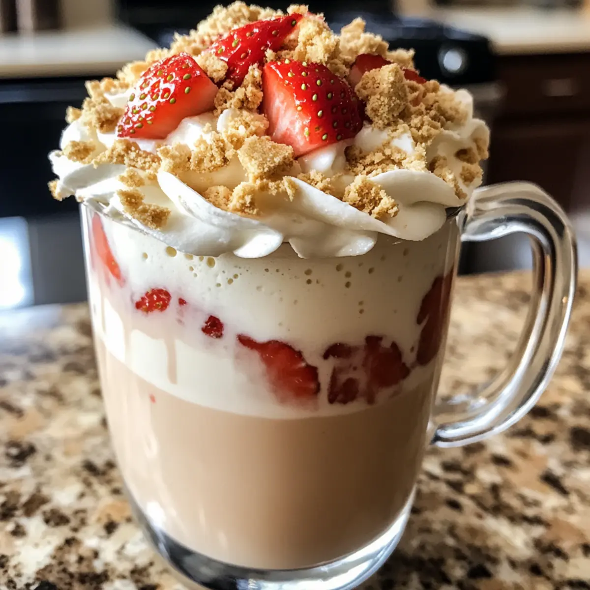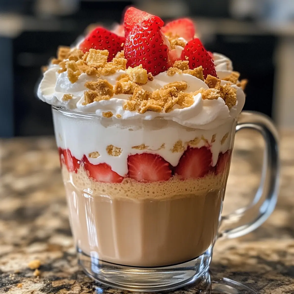 For the finishing touch, add a generous dollop of whipped cream on top, letting it melt slightly into the warm latte. Sprinkle crushed graham crackers over the whipped cream for added texture and flavor. If desired, drizzle extra strawberry syrup or add fresh diced strawberries for an indulgent garnish.